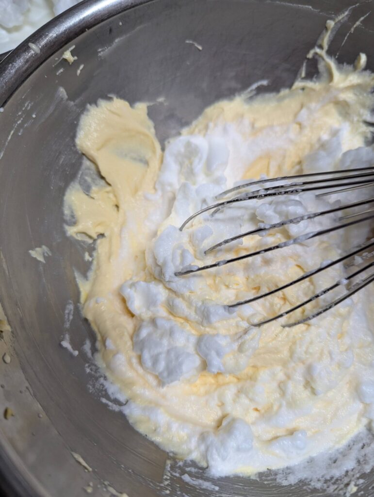 10.薄力粉が混ざったら、メレンゲを2回に分けて混ぜていきます。