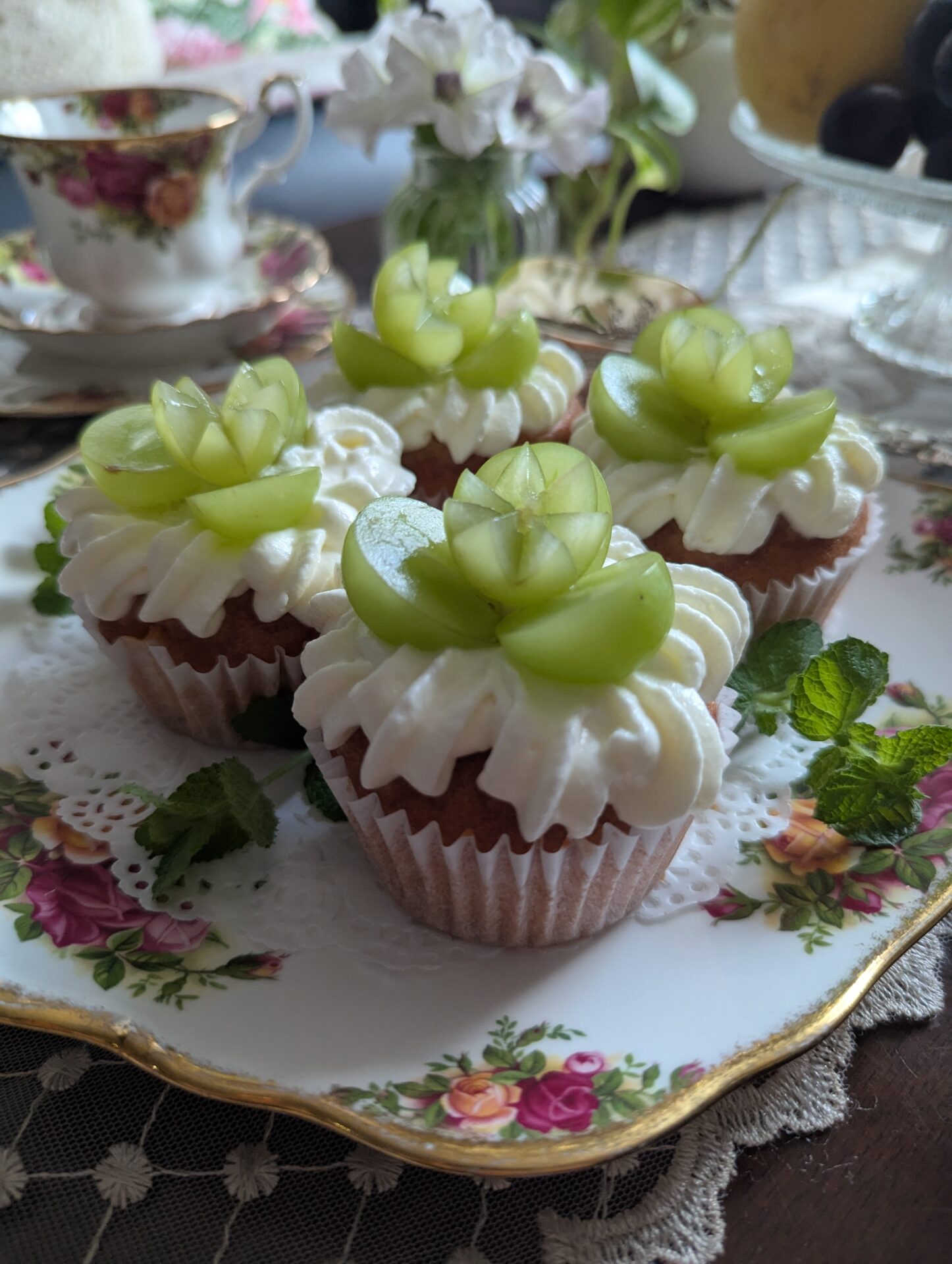 15.マフィンの上部を少し切り落として生クリームを絞り.マスカットを乗せます。