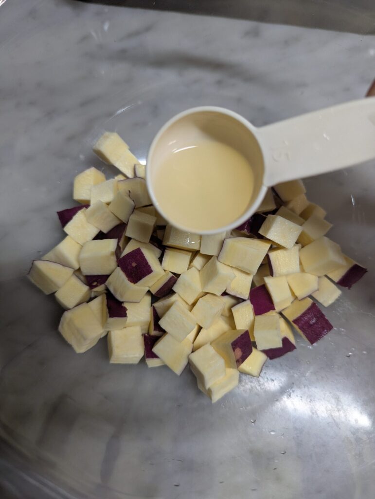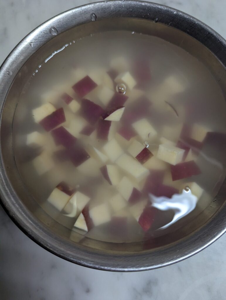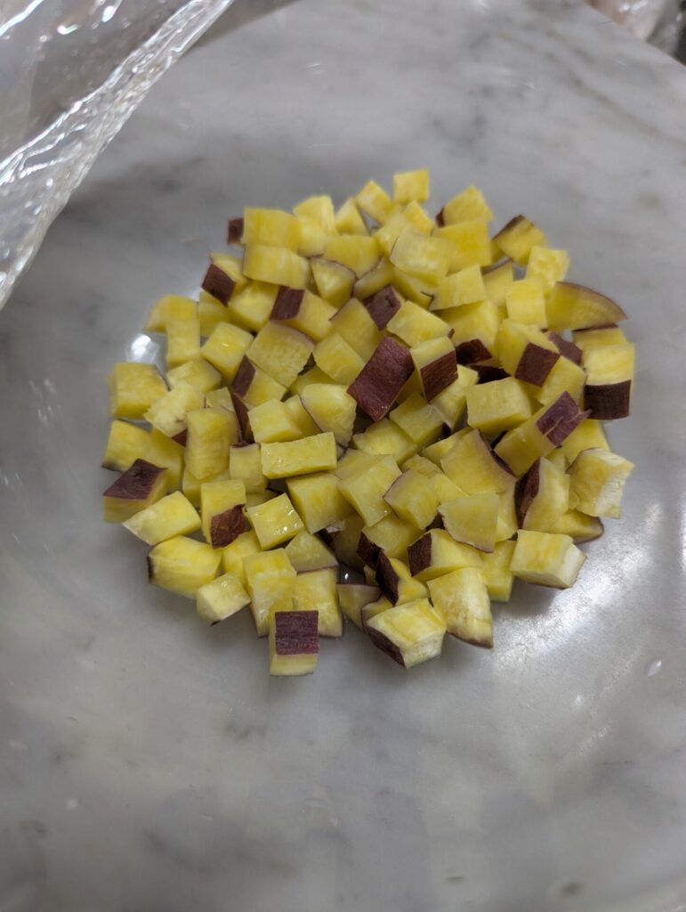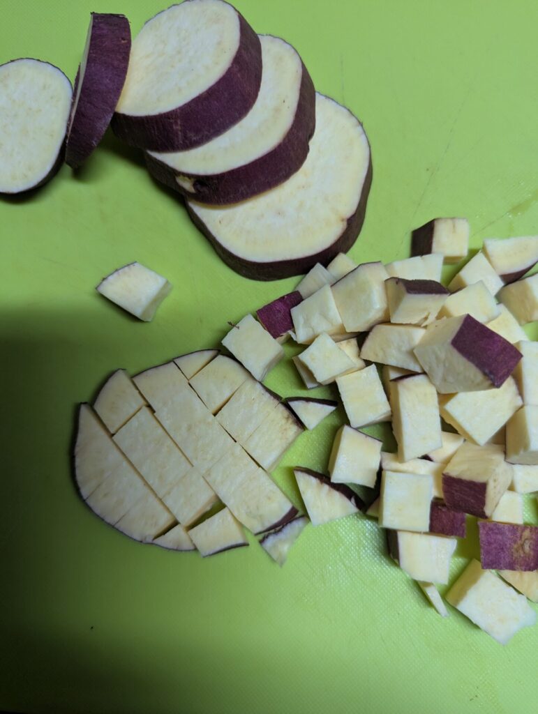 1.さつま芋は皮ごと使うのでタワシ等で良く洗い、1㎝角に切り水にさらします。