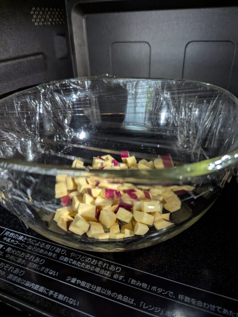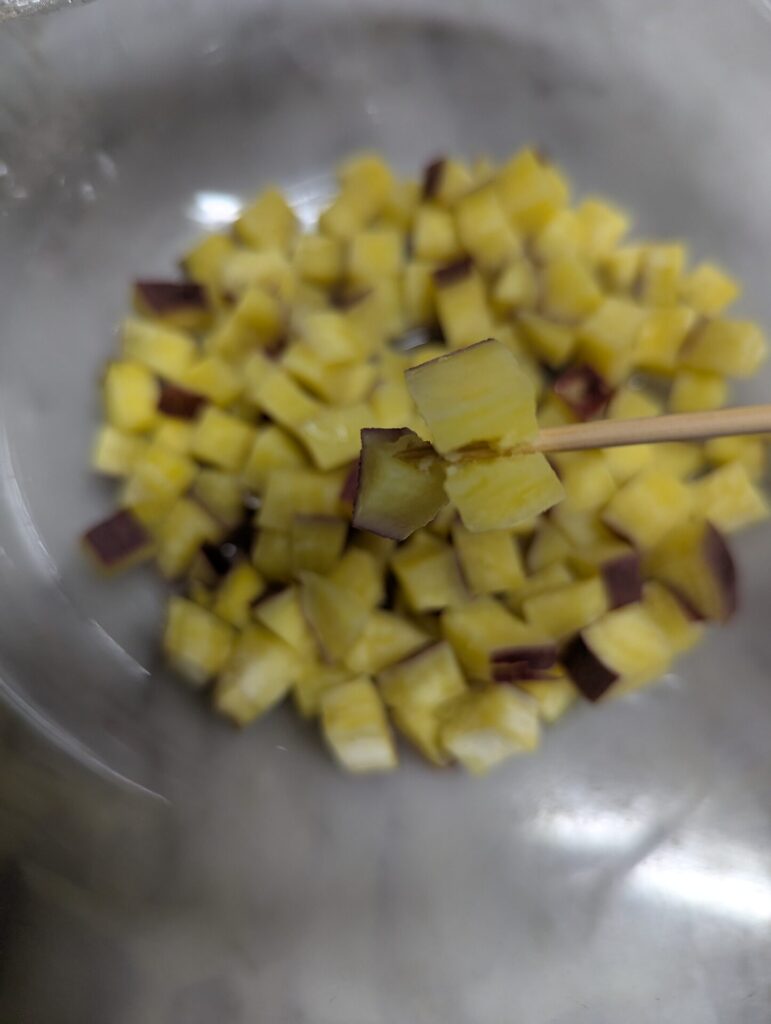 お芋に竹串が刺さるかチェックします、まだ硬い時は1~2分追加して加熱します。お芋によって火の通りが違うのでレンジの時間は調整して下さいね。