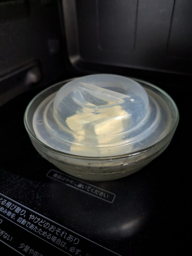 2.耐熱容器に入れ、みりん(大さじ1)をふり掛けて電子レンジで加熱します。(600wで5分)