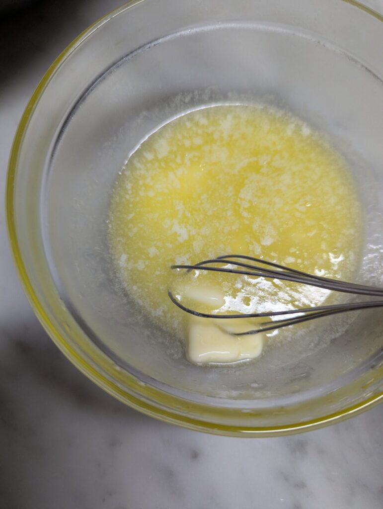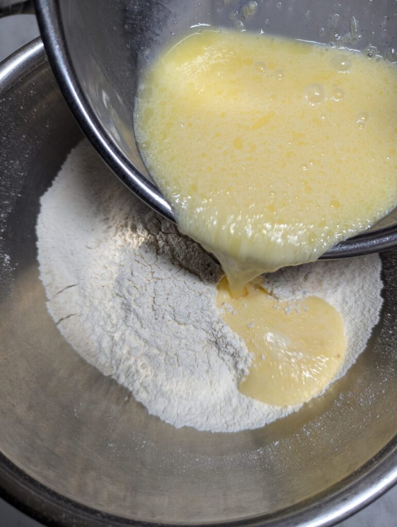 4.最初にバター(50g)を溶かし、卵(1個)牛乳(70ml)を混ぜた中へ入れます。