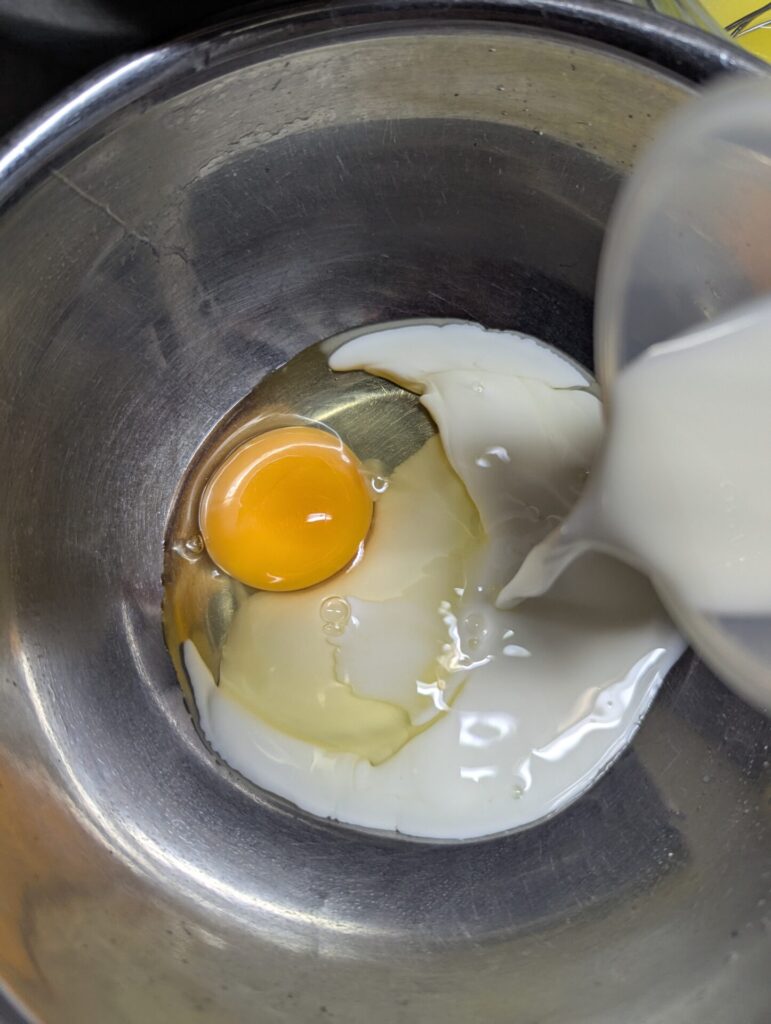 5.小さめなボールで卵と牛乳を混ぜ合わせます。