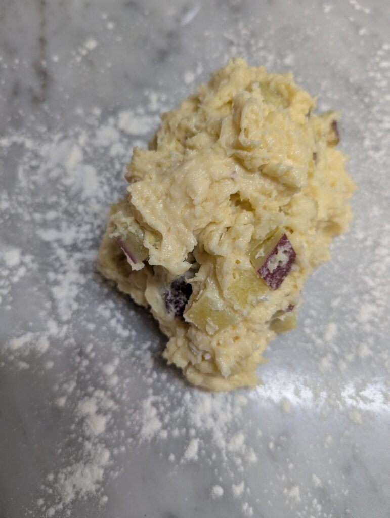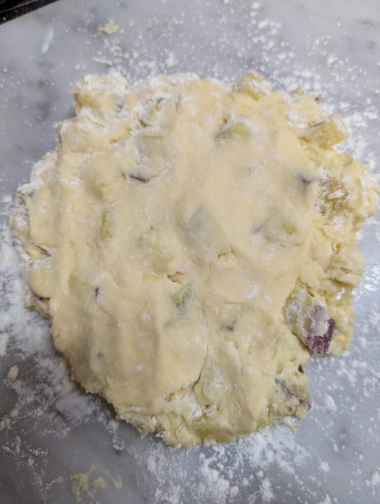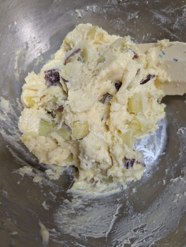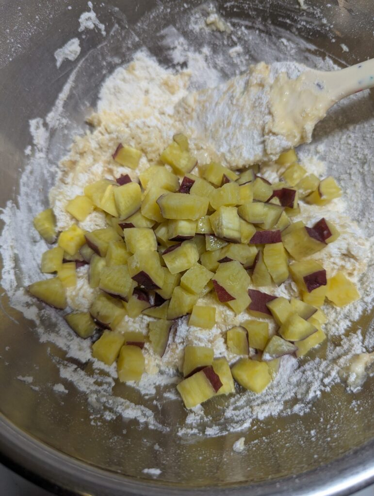 9.完全に粉が混ざる前にさつま芋を投入し生地をまとめます。