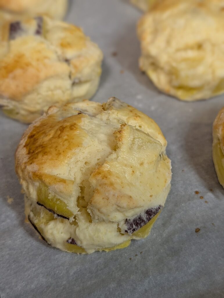 さつま芋を皮ごと生地に混ぜ込んだ食物繊維たっぷりのスコーンです。溶かしバターで簡単に生地を作りますが、腹割れもできるレシピです。