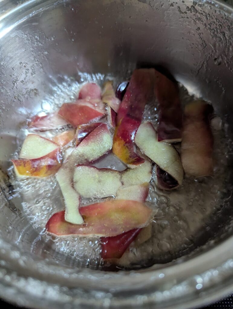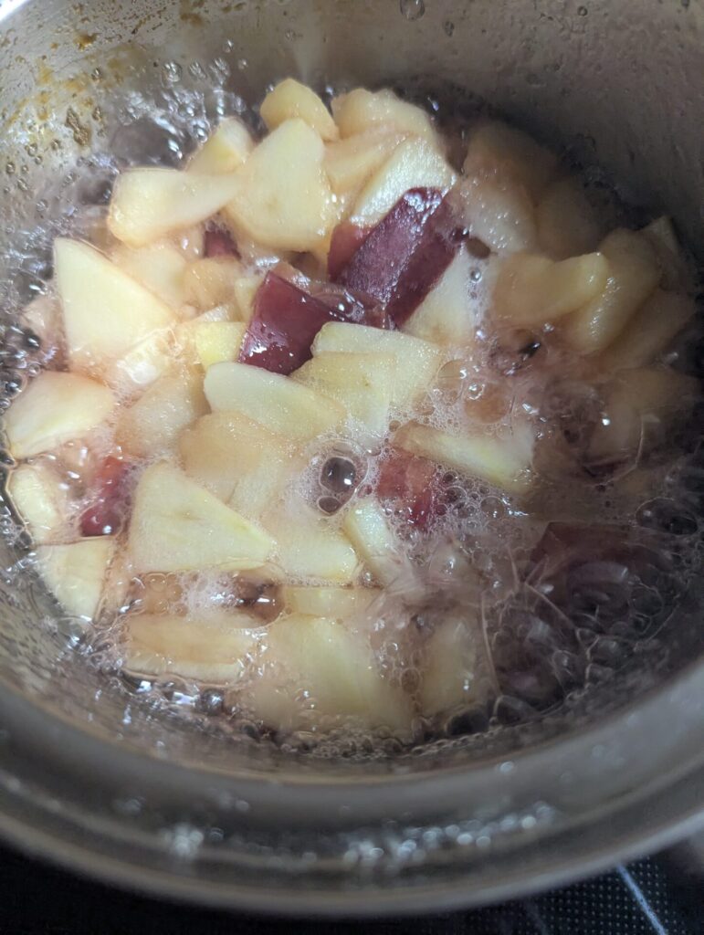 りんごと砂糖(100g)を加えて煮ます、煮汁がピンク色に染まったら途中で皮を取り出します。