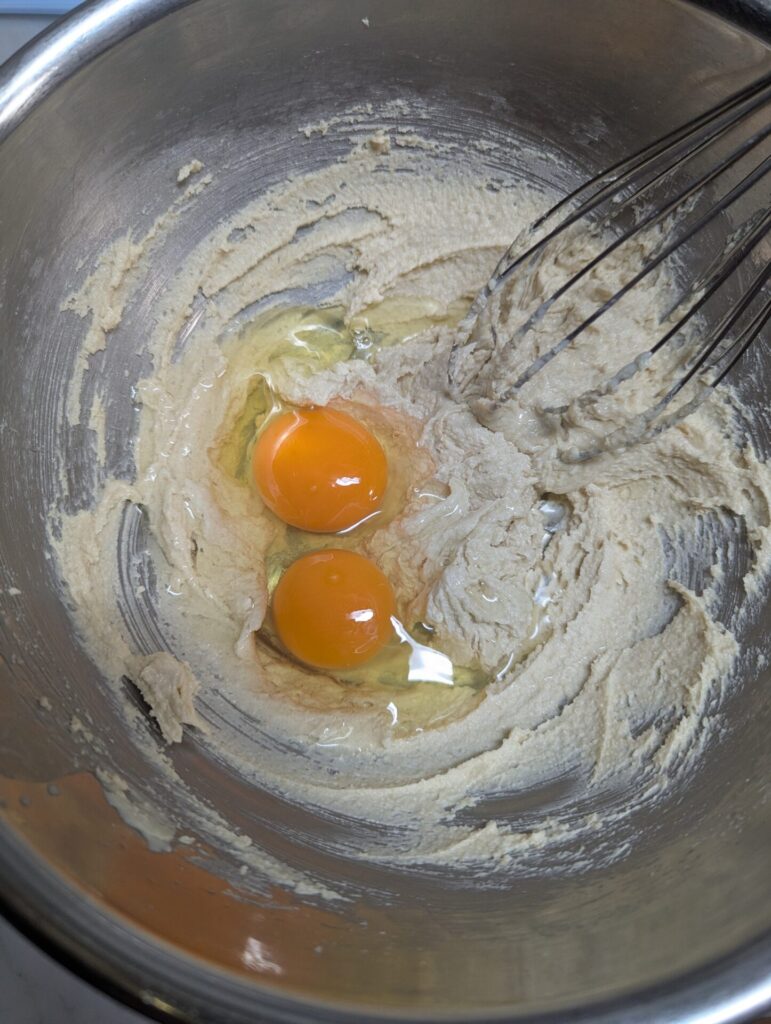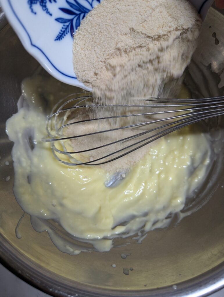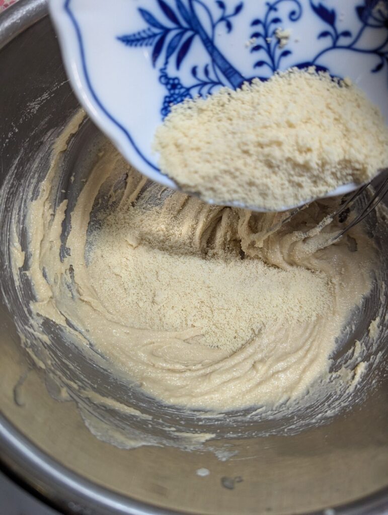 アーモンドプードルを先に混ぜておくと卵を入れた時にバターと分離しづらくなります。