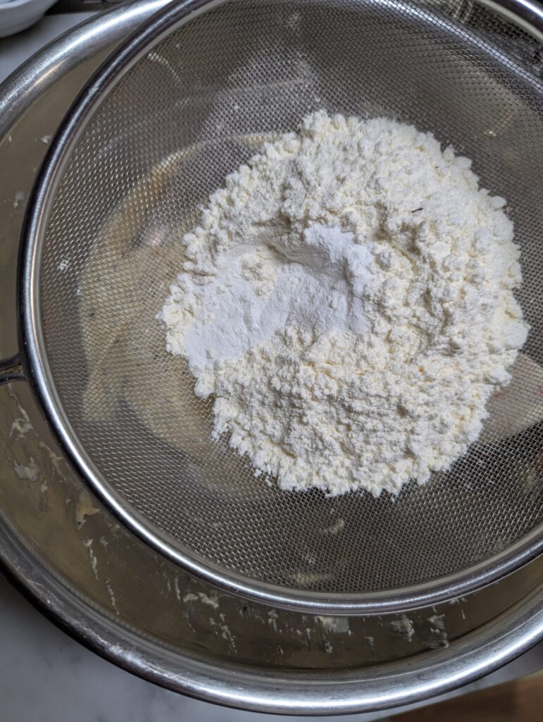 5.薄力粉(120g)、ベーキングパウダー(小さじ1)を一緒に振るい入れ、ゴムベラでさっくりと混ぜ合わせます。