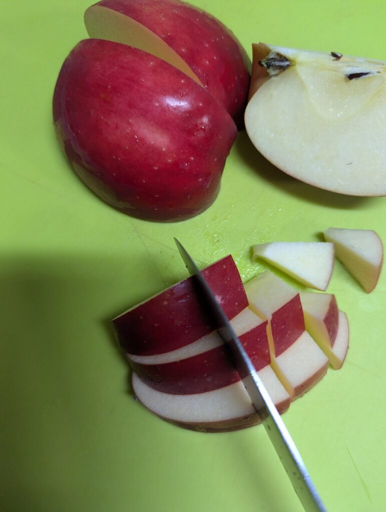 四つ割りにして芯を取り、更に三等分にして厚めにカットします。