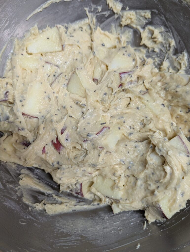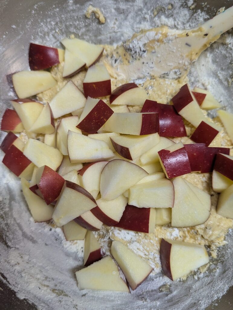 6.粉類が完全に混ざる前にカットしたりんごを加えて全体を混ぜ合わせます。