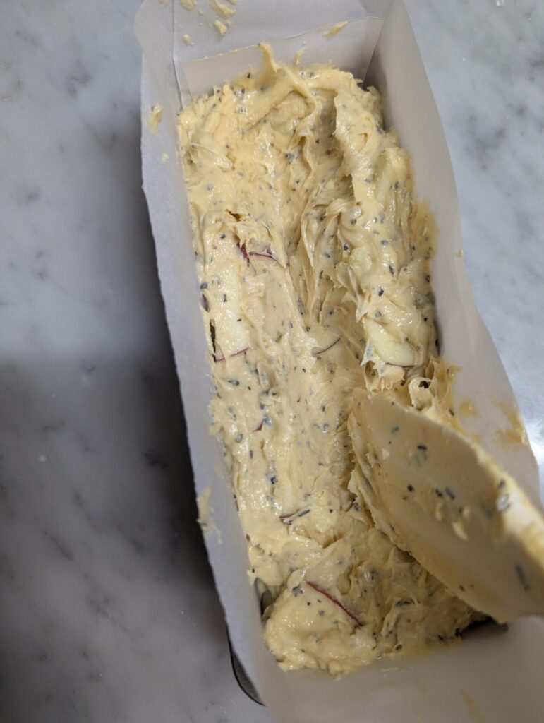 8.パウンド型に生地を入れ、中央をくぼませて火の通りを良くします。
