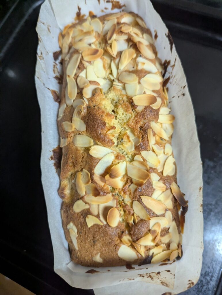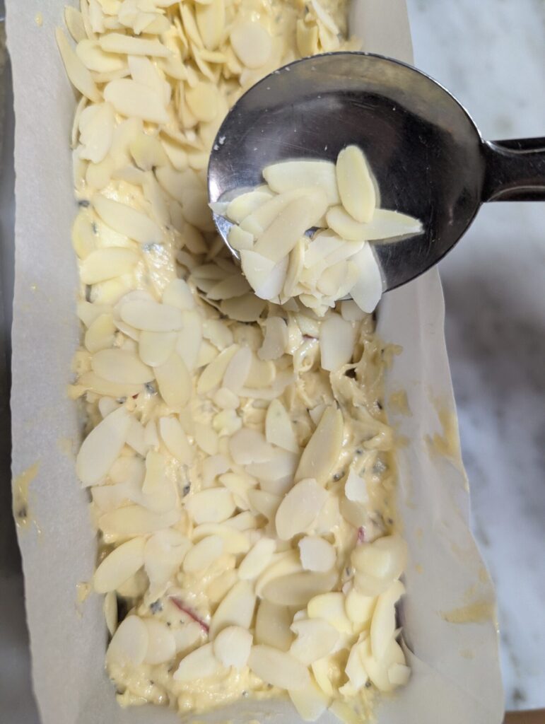 9.スライスアーモンドを上に散らし、予熱した170℃(~180℃)のオーブンで40分~45分焼きます。