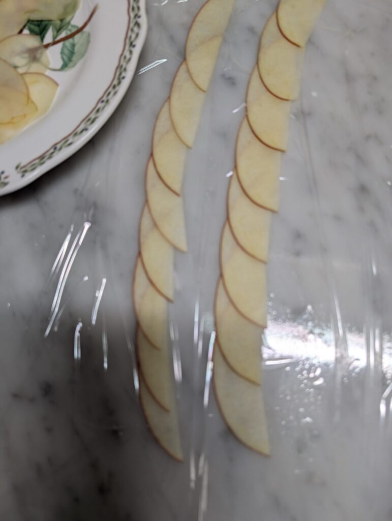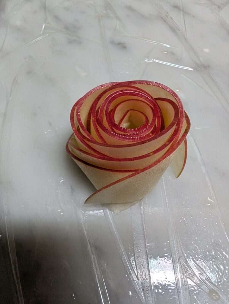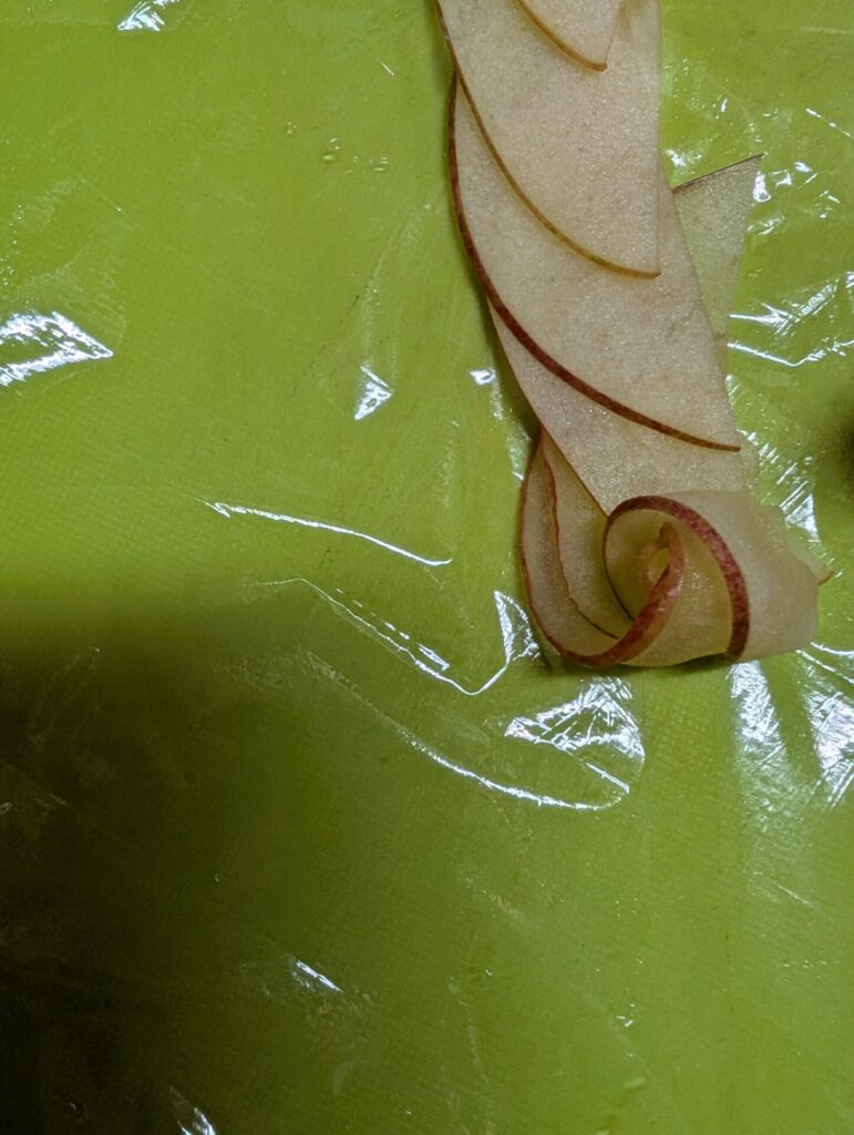 少し加熱すると、りんごがしんなりとして巻きやすくなります。但し、加熱しすぎると巻きやすいですがりんごが開きにくくなります。
