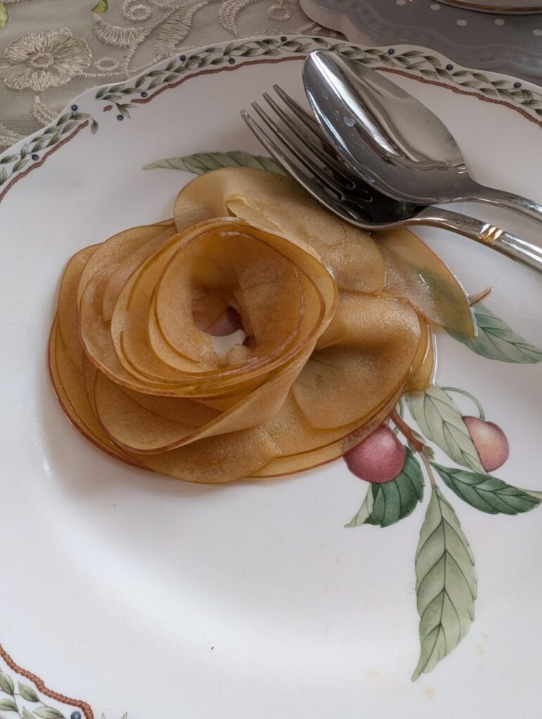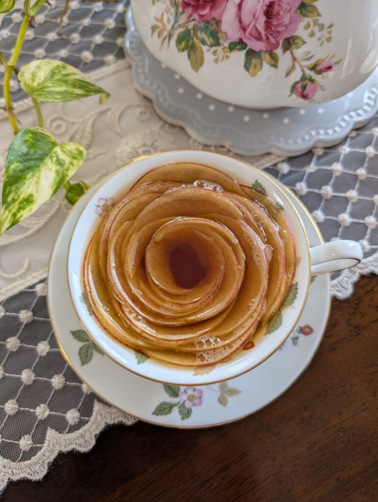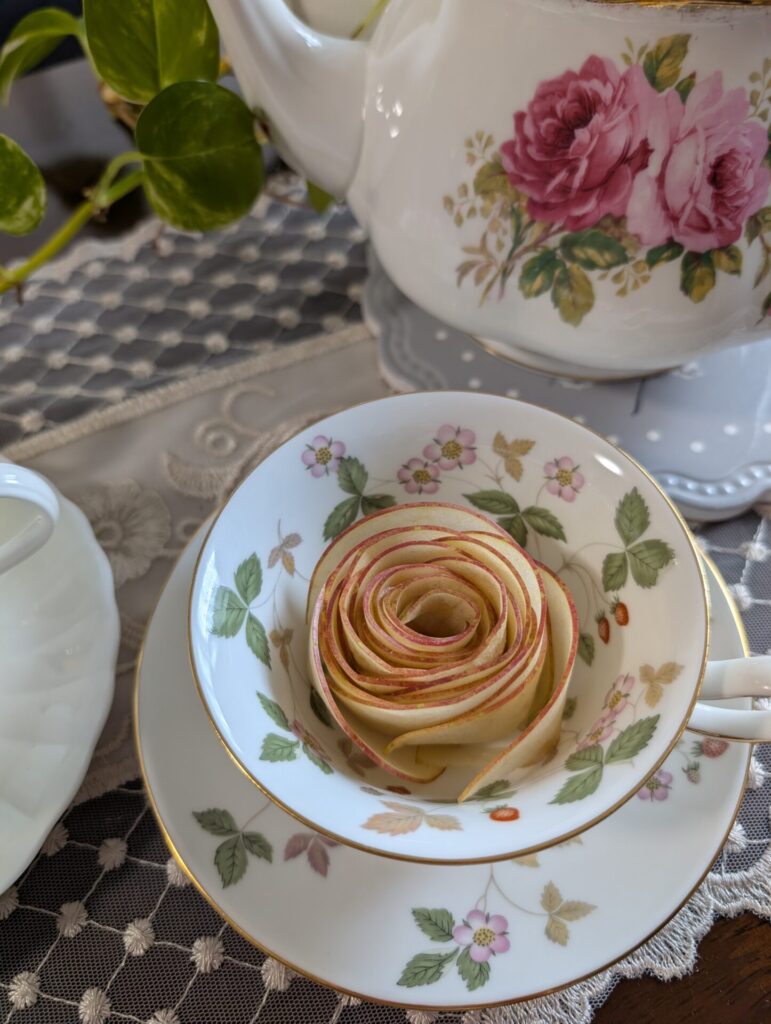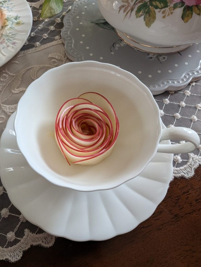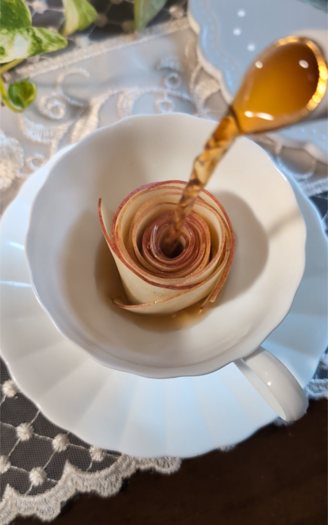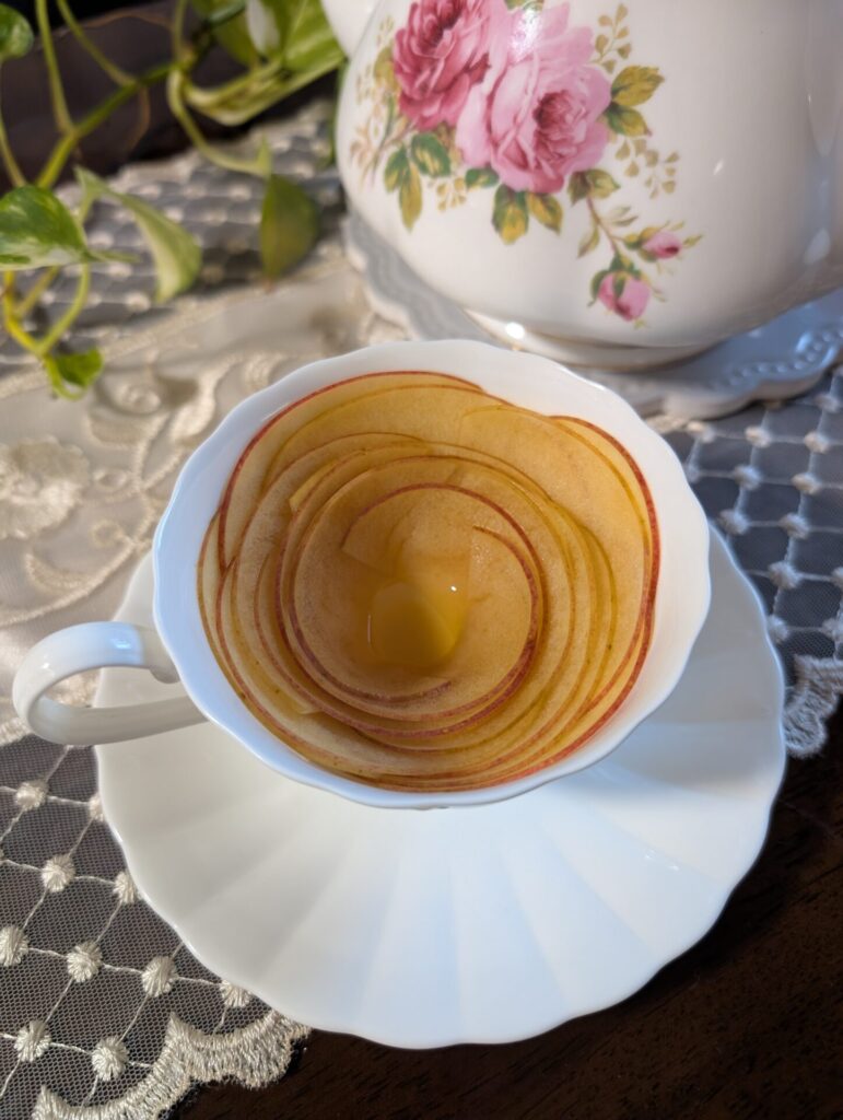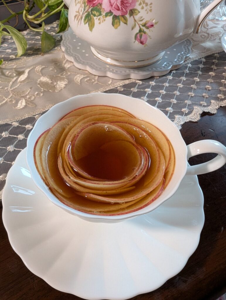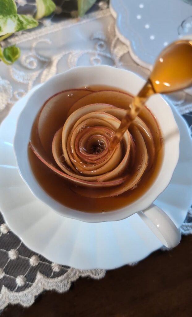 紅茶を注ぐとりんごがバラのように花開くアップルティーです。生のりんごを薄くスライスするのがポイント、くるくる巻いて作ります