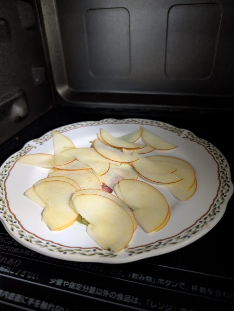 6.りんごを平らに広げて電子レンジ600Wで20秒~30秒加熱します。