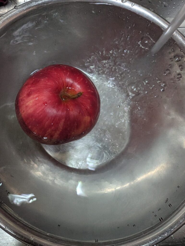 1.りんごは皮ごと使うので良く洗います。スポンジに塩を付けてゴリゴリ洗います。